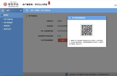 拟申请注册为统一登记系统常用户的机构,可在系统首页的用户开通申请页面,选择使用“电子营业执照”微信或支付宝小程序在线扫码验证身份,授权事项选择“电子政务一人民银行一动产融资统一登记公示”。验证成功后,统一登记系统自动审核通过,机构常用户重新登录后可开展后续业务操作。